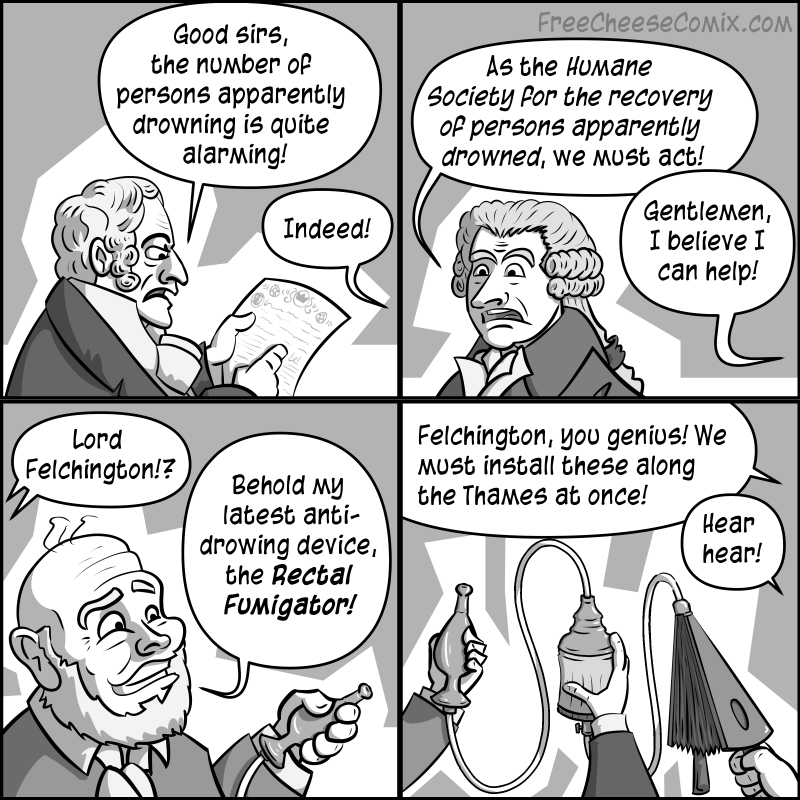 The thinking went that nicotine in tobacco was thought to stimulate the heart, while the heat from the smoke would warm the victim from the inside, while the dry air would potentially removing any “excessive moisture”. The result? A happy, healthy, un-drowned person with a strong heart beat and warm, dry insides! It was like a defibrillator and a towel, but for your butt!