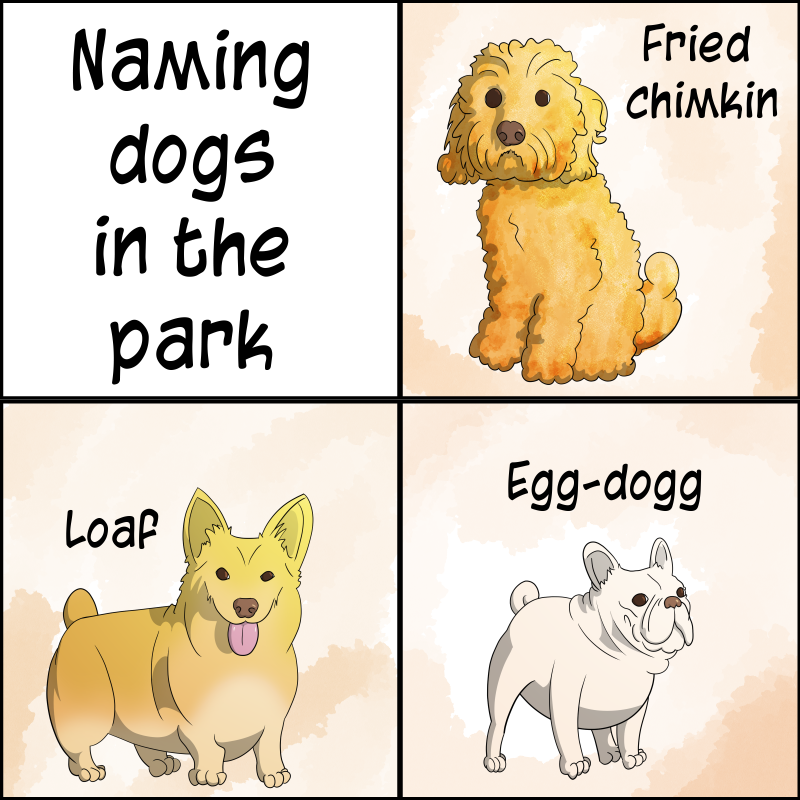 Just some of the dogs I’ve named in my local dog park based on their relative appearance to food.